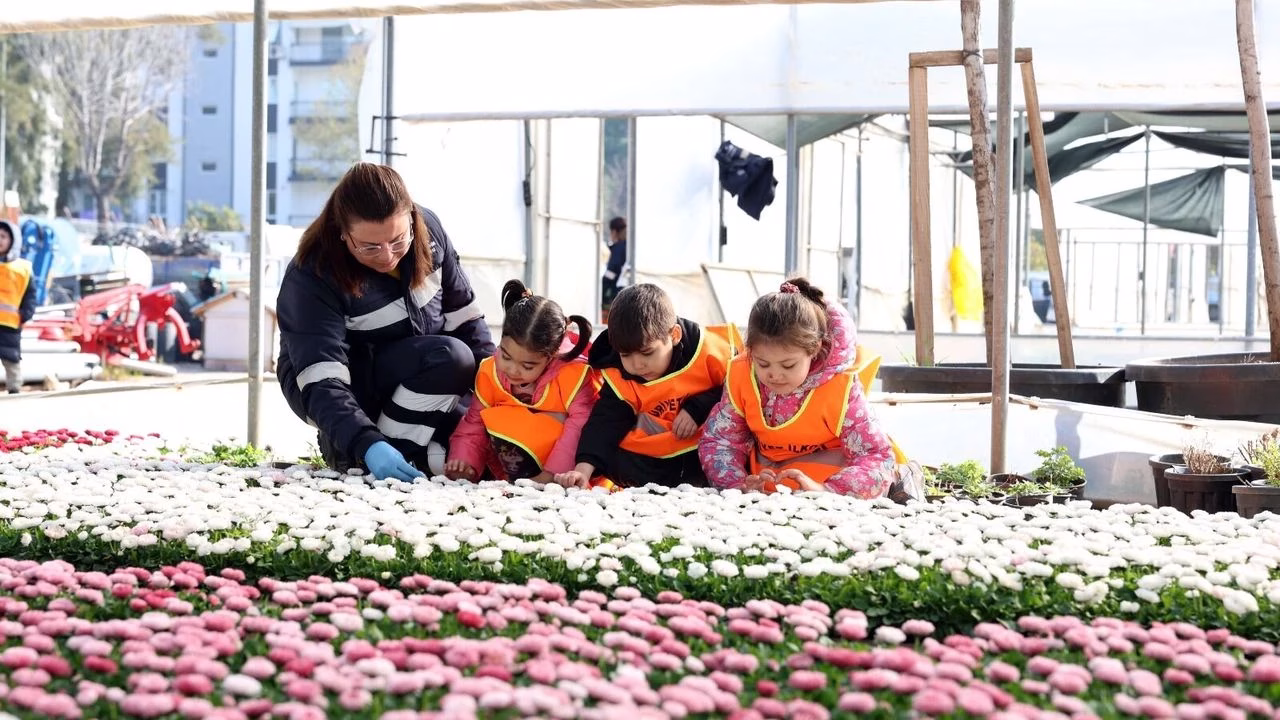 Cumhuriyet İlkokulu anasınıfı öğrencileri ve öğretmenleri, derslerini Aydın Büyükşehir Belediyesi’nin Mimar Sinan Mahallesi’ndeki fidanlığında işledi.