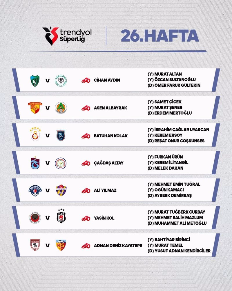 Kaynak: https://www.aspor.com.tr/spor-toto-super-lig/2026/03/12/trendyol-super-ligde-26-hafta-maclarinin-hakemleri-aciklandi