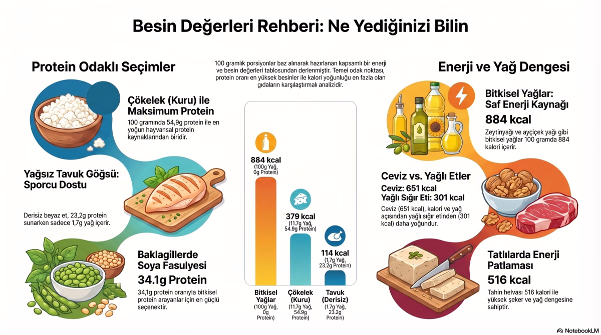 Kalori cetveline bakıldığında, 100 gramında yaklaşık 884-902 kcal barındıran bitkisel ve hayvansal yağlar, enerji yoğunluğu en yüksek grup olarak kaydedildi. Tatlılar kategorisinde ise havuçlu kek gibi ürünlerin bütün halindeki kalori miktarları (6175 kcal), porsiyon kontrolünün hayati önem taşıdığını gösteriyor.